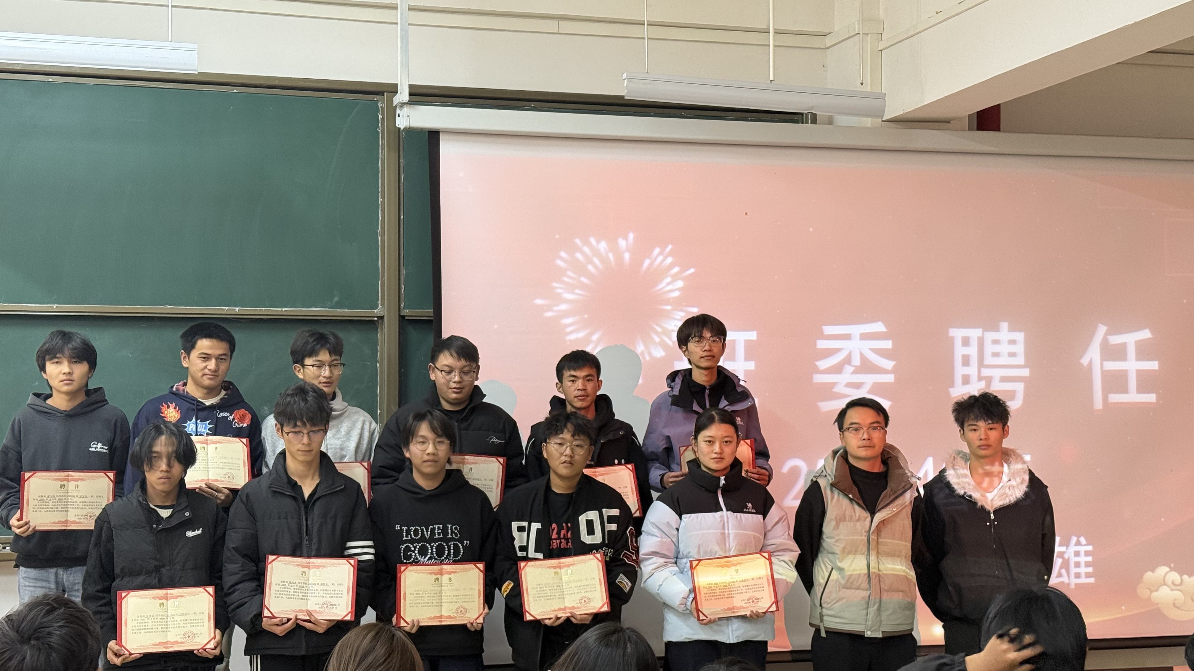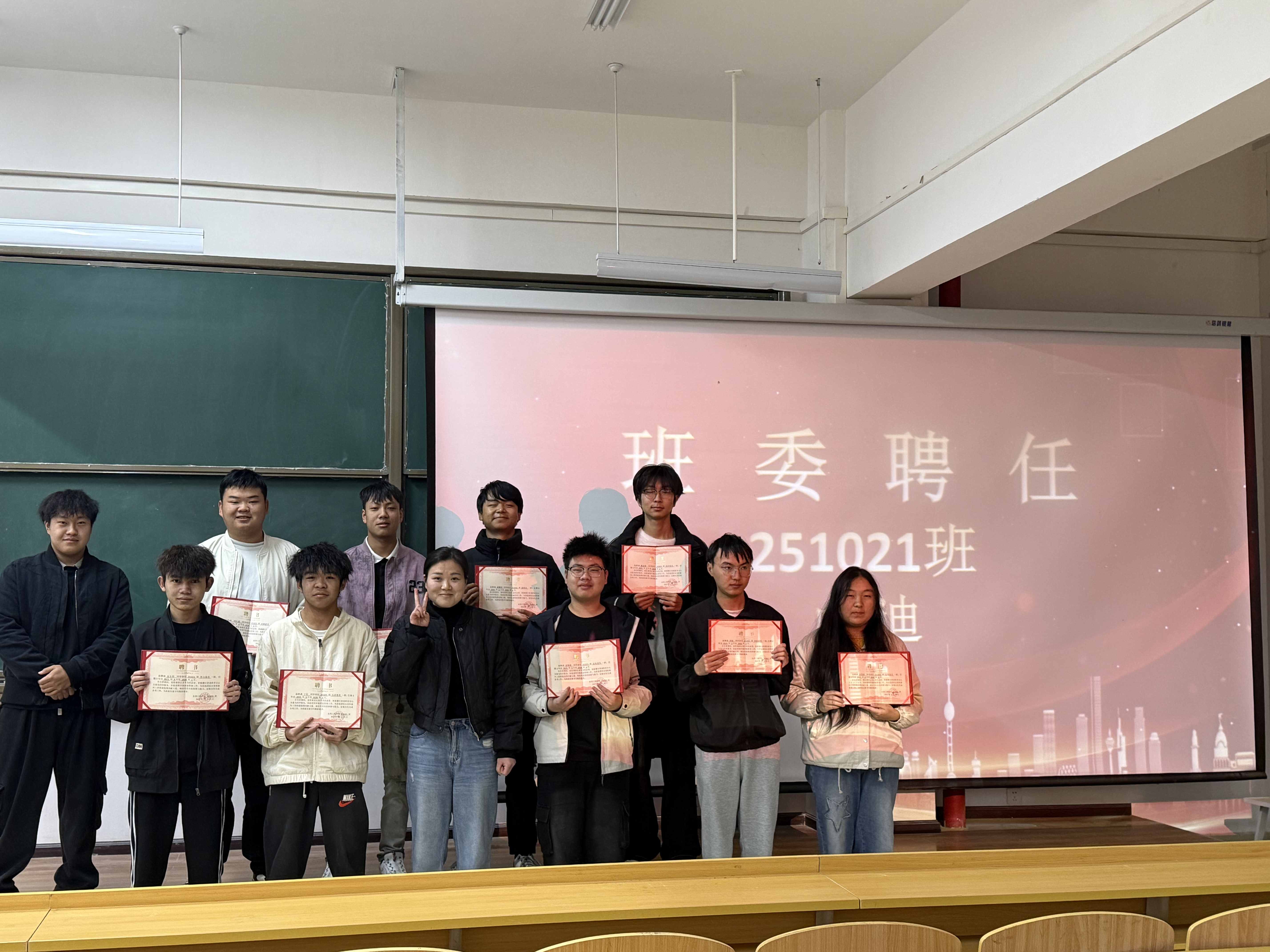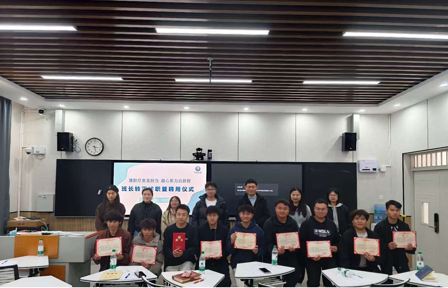 在庄重的聘用环节,学工部为通过评议的班长及班委颁发正式聘书,标志着各班学生干部团队的正式组建,责任交接顺利完成。班长代表陈东兵发言,分享服务班级的心得体会与成长感悟,表达继续带领班级向前发展的信心与决心。