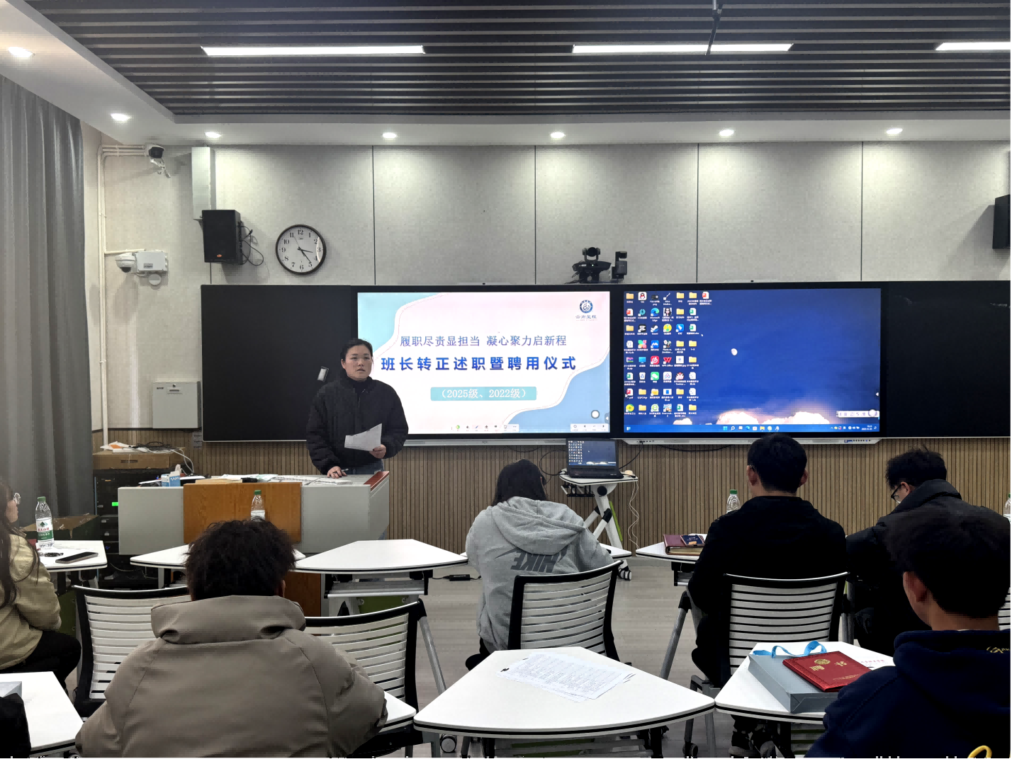 仪式中,来自251041、22142、251051等12个班级的班长依次登台述职,围绕试用期内的班级管理、活动组织、学风建设与服务成效等方面进行汇报,并结合实际案例与数据展示工作成果,客观总结不足,明确改进方向。随后,各班班委接收履职能力评估,简要陈述本学期工作与岗位认识,由辅导员进行综合评价。