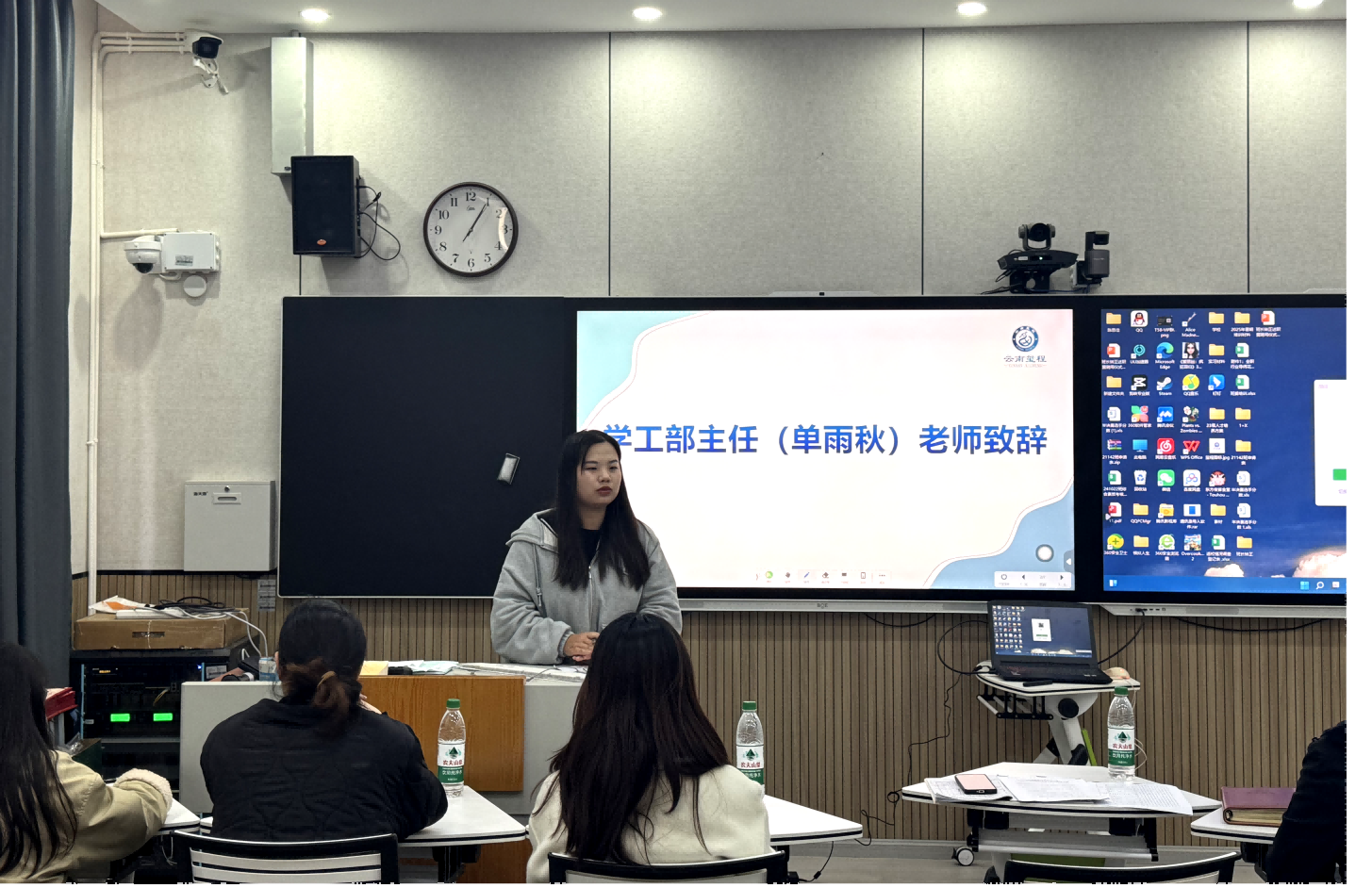 学工部负责人单雨秋老师在致辞中充分肯定学生干部在试用期的付出与表现,强调学生干部在“桥梁”“纽带”“粘合剂”的重要角色,鼓励全体受聘同学以此为新起点,不断提升能力、加强协作,共同营造积极向上的班级氛围。班主任代表卢迪老师也对班长们提出期望,勉励大家在服务中进步、在担当中成长。